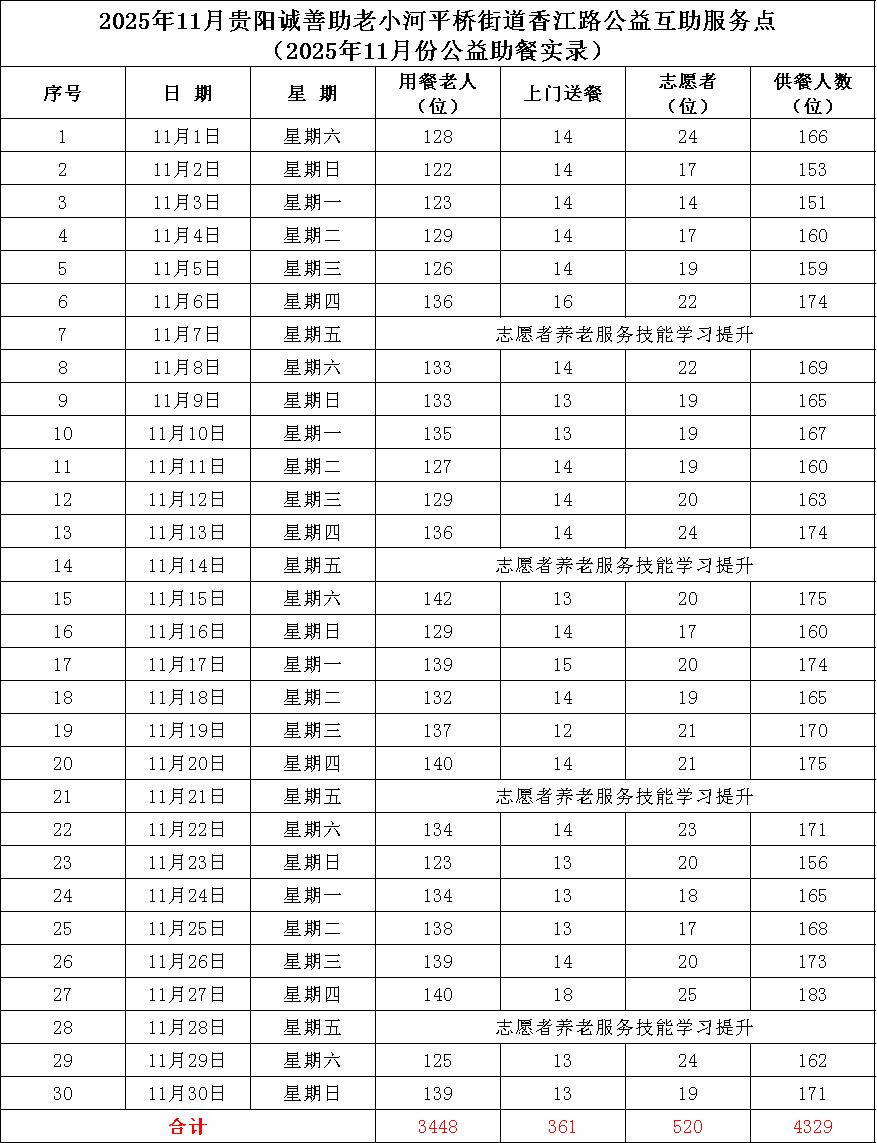 本月助餐实录 3 贵阳诚善助老 花溪小河平桥街道香江花园公益互助服务点 2025年11月公益助餐实录 公益助餐天数:26天 共计公益助餐:4329人次 全月服务志愿者:520人次 日均服务志愿者:20人次 日均公益助餐:167人次 本月助餐实录 4
