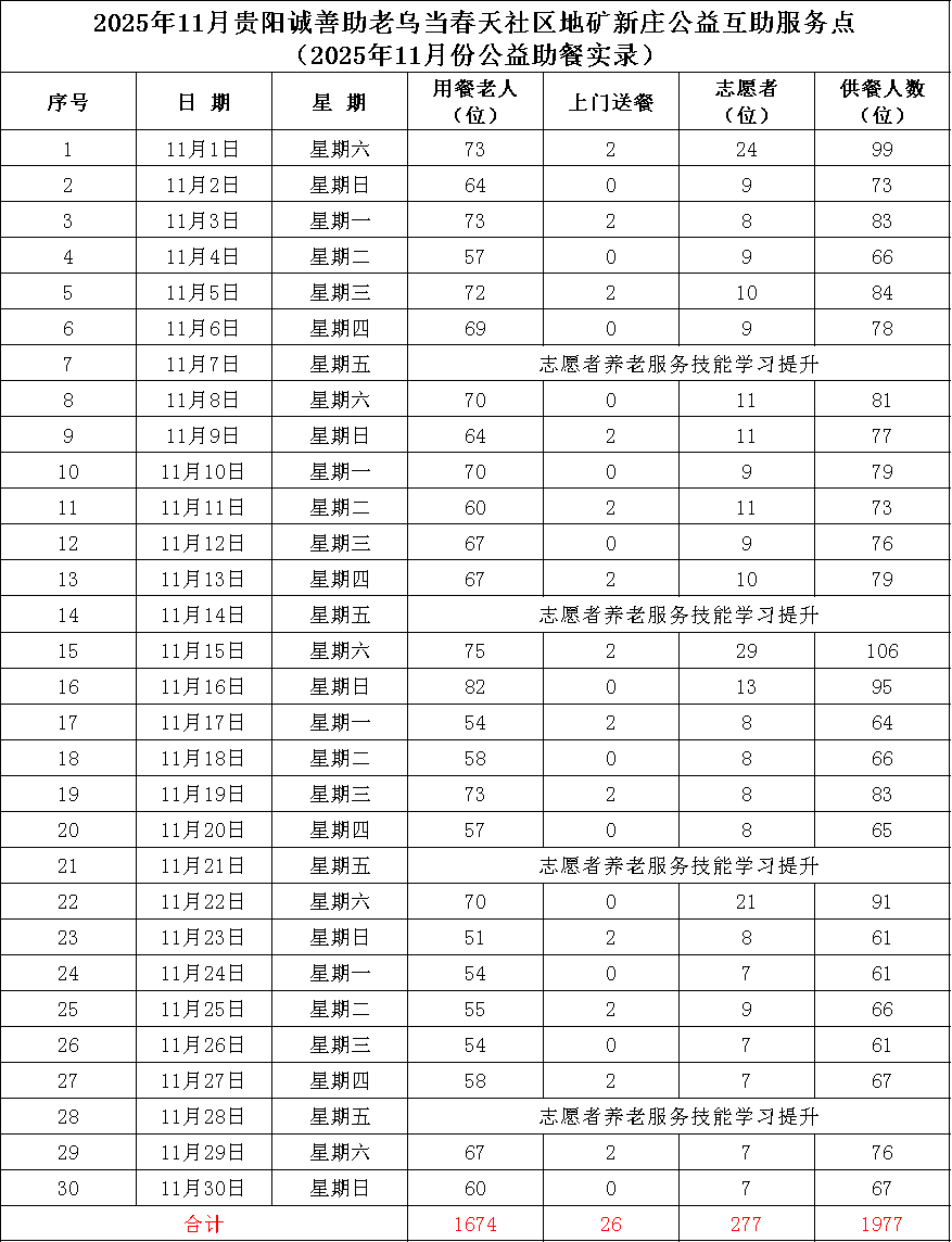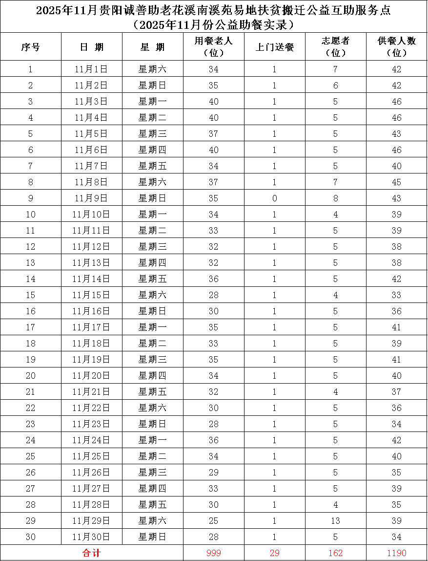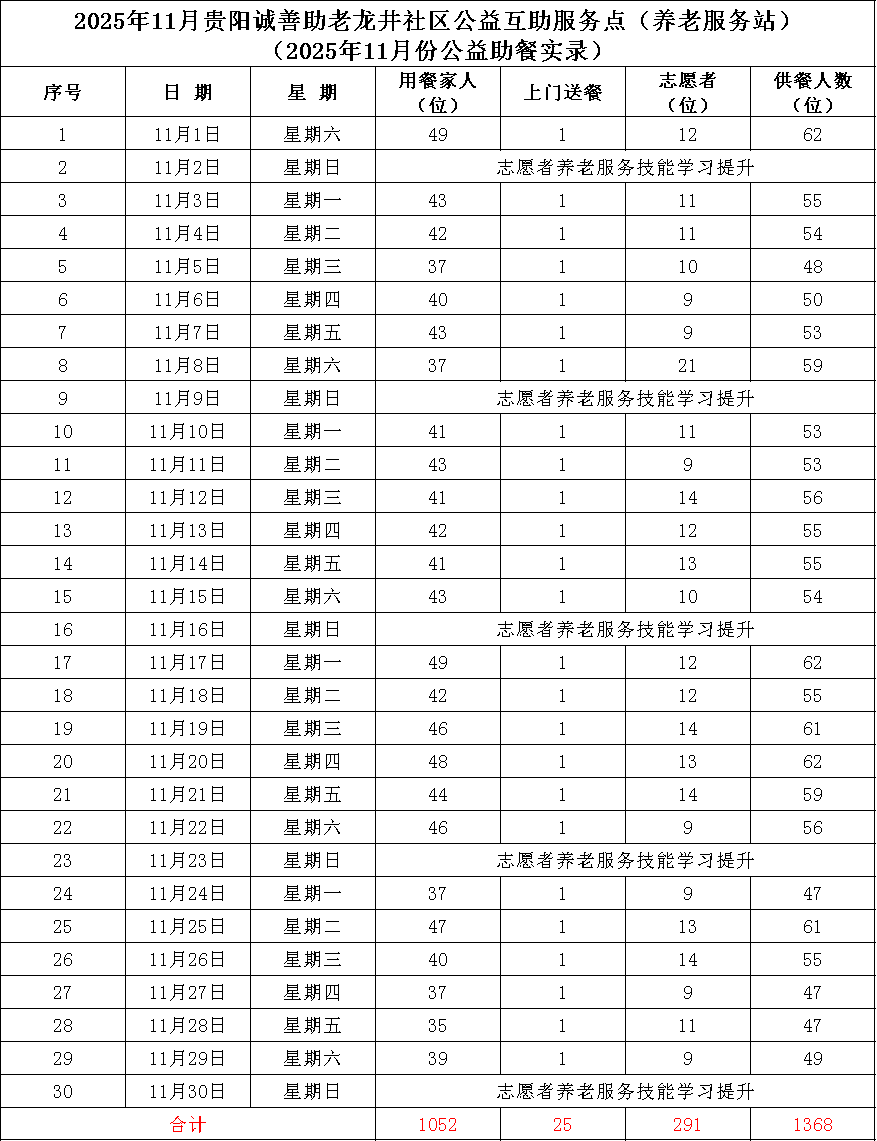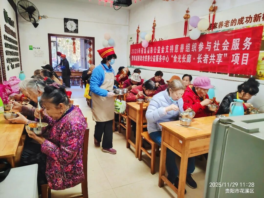 本月助餐实录 5 贵阳诚善助老 毓秀街道龙井社区公益互助服务点 2025年11月公益助餐实录 公益助餐天数:25天 共计公益助餐:1368人次 全月服务志愿者:291人次 日均服务志愿者:12人次 日均公益助餐:55人次 感恩看到这篇文章的所有朋友们。 如果您自己或者家里有老人,是以下七类情况之一,“贵阳诚善助老公益互助服务点”真诚地欢迎你们。 你们可以就近选择我们“贵阳诚善助老”的某个公益互助服务点,前去享用公益助餐和关爱陪伴。 一分钱都不用付!!! 互助服务点地址见本文下方。 贵阳诚善助老 慈善公益互助服务点 欢迎您回家 聚焦城市中面临多重困境的老年人群体,重点帮扶三大类老人: 经济困难型老人 1.低保、特困、低收入家庭老人 2.无固定收入来源的独居/空巢老人 3.因重大疾病或残疾导致经济拮据的老人 生活照料缺失型老人 1.子女长期异地居住的空巢老人 2.因身体失能、半失能无法独立备餐的高龄老人(如80岁以上) 3.双失老人(失独且无近亲属) 社交孤立型老人 1.丧偶/离异后长期独居的老年群体 2.无社交理念、缺乏社交网络的老人 3.语言沟通障碍自我封闭的老人 4.代际认知鸿沟脱节群体的老人 公益服务点地址 不能等的公益助餐 诚善助老爱的接力 欢迎您成为志愿者 感恩各界爱心同仁
